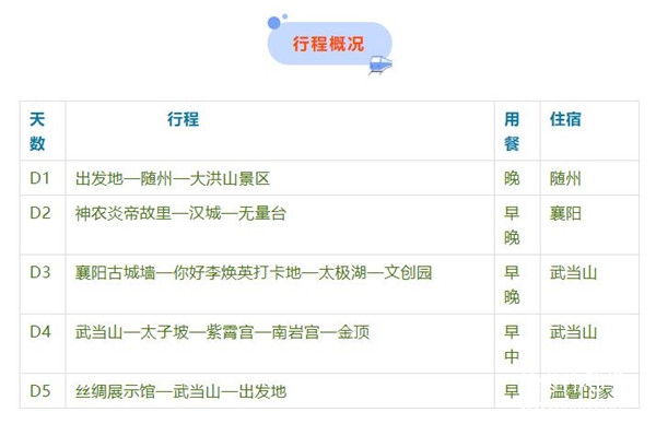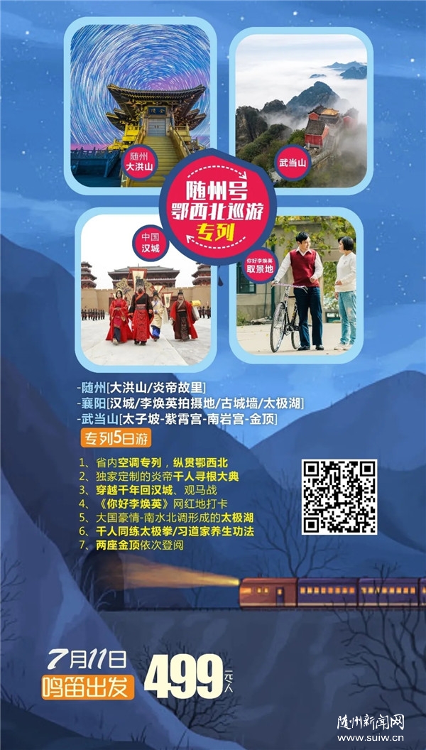 您有沒有想過,坐上一輛舒適的空調專列,在盛夏酷暑之際,悠然悠然地行駛在鄂西北廣袤的土地上,與山川對話,聽江河呢喃,看盛世繁華、美景成畫,讀人文自然、享生命之傳奇美好,穿越千年、夢回大漢…… 那么來了,由湖北峽州國旅策劃組織的我省首發“隨州號”鄂西北巡游專列將于7月11日鳴笛出發,一線串連隨州、襄陽、武當山知名景點,精心打造屬于這個夏季非同一般的旅行體驗,讓您在綠水青山間,感受“自到仙山不知老,凡間喚作幾千年”的愜意與清涼。 隨州、襄陽、武當山5日游搶先看 行程亮點 旅行專家首推景點,行程輕松不勞累!留夠充足游覽時間! ★ 特別安排省內空調專列,行程舒適安全有保障。 ★ 獨家定制炎帝千人尋根大典,追尋炎帝始祖的前世今生 ★ 重溫革命先烈崢嶸歲月--大洪山革命紀念館 ★ 金戈鐵馬聞征鼓,只爭朝夕啟新程,觀馬戰,穿越千年回漢城。 ★ 襄陽網紅景點《你好,李煥英》網紅打卡地 ★ 探尋大國豪情——南水北調形成的太極湖 ★ 游覽世界文化遺產【武當山】,體驗千人同練太極拳、習道家養生功法。 行程安排 第一天 出發地—隨州-大洪山 用餐:晚 住宿:隨州 (咸寧08:20發車/武昌 10:00 發車/孝感 10:40發車/隨州 12:26 抵達) 歡迎來到炎帝故里--隨州! 客人乘專列赴炎帝故里隨州—隨州古稱"漢東之國",以"古、奇、美、新"而著稱,為全國歷史文化名城。被稱為炎帝故里,編鐘古樂之鄉,現已成為海內外炎黃子孫尋根問祖的圣地。 【大洪山風景區】大洪山風景區又名綠林山,西漢末年的農民起義——綠林起義就是發生在這里。1988年建立了隨州大洪山名勝風景區。景區方圓三百三十多平方公里,橫臥江漢, 蜿蜒荊襄,氣勢磅礴,風光秀麗,具有"一山分四季,十里不同溫"的氣候特點。 【大洪山革命紀念館】大洪山的革命史,始自辛亥革命,賀龍、徐向前、陶鑄、李先念等老一輩革命家,為中國民族獨立和解放,曾戰斗在大洪山。 【慢游白龍池】 山水相依的白龍池,這里地勢開闊,群山環抱,植被繁茂。湖光山色,相映成趣,被譽為"鄂中瑤池"。白龍池年均氣溫18℃,空氣濕度適中,是避暑佳境。 【寶珠峰大慈恩寺】自唐宋以來,這里一直是佛教圣地,登臨金碧輝煌的金頂,晴日時山形水勢盡收眼底,大慈恩寺的金頂足以媲美峨眉金頂! 備注:具體抵離時間,以鐵道批復為準,敬請諒解! 第二天 神農炎帝故里-漢城-無量臺 用餐:早 晚 住宿:襄陽 (隨州/襄陽 12:16-13:44) 【炎帝神農故里】為國家 4A 級風景區,主要包括"尋根謁祖朝圣區""圣跡觀光體驗區""農耕文化展覽區"和"自然生態景觀區"。2009 年起,以炎黃子孫尋根謁祖為核心,以體驗炎帝神農的農耕文化、醫藥文化、貿易文化、原始藝術文化為根本的"世界華人炎帝故里尋根節"活動在此舉行,受到國家、省市領導的高度重視和關懷。炎帝神農故里景區已成為海內外炎黃子孫尋根祭祖、旅游觀光的勝地。 【漢城】漢城景區以漢代建筑風格為主體, 以現代新型文化為引領,建設一座集影視拍攝、旅游觀光 、現代商貿為一體的仿古建筑群體。漢城廣場有四大氣勢磅礴、雄偉壯觀的雕塑群:光武省親、真定喜宴、昆陽搬兵、云臺二十八將,目前是中國最大一組青銅雕塑群。 【無量臺】無量臺風景區是一座儒、釋、道三教文化共存共榮的古文化圣地。在這里,優秀的傳統文化積淀十分豐厚,不僅有以真武、老君為代表的道教文化,還有以觀音、彌勒為代表的佛教文化,更有以劉秀、關公為代表的獨具地方特色的東漢儒家文化。 第三天 襄陽古城墻-衛東廠-太極湖-文創園 用餐:早 晚 住宿:武當山 (襄陽/武當山 12:50-14:38) 【襄陽古城墻】襄陽古城約始筑于西漢高帝六年,三面環水,一面靠山,易守難攻。襄陽古城被歷代兵家所看重,是中國歷史上最著名的古城建筑防御體系之一,也是中國最完整的一座古代城池防御建筑。 【衛東廠】湖北衛東控股集團有限公司前身是國營衛生機械廠,建于 1964 年,至今保留著三線工廠的歷史原貌。《你好,李煥英》這部電影中的大禮堂、劃船的水庫、工人文化宮、職員工食堂、幼兒園、籃球場、櫥窗等場景均在該公司家屬區取景。 【太極湖】隨著南水北調源頭--丹江口水庫水位的升高,水面延伸至武當山腳下,形成了一個波瀾壯闊的湖面,因為這里太極交匯,山水相依,故名“太極湖”。風景美麗如畫,山清水碧,秋水共長天一色,落霞與孤鶩齊飛。 參觀【武當民俗文化產業園】(約 60 分鐘) 600 年前,永樂帝北建故宮南修武當,其中武當山玉虛宮位列九宮之首,就坐落于玉虛宮東宮,這里匯集了李時珍在武當山發現的 400 多種中草藥,有傳承千年的道教釀酒文化,以及張仲景、孫思邈等為代表的道醫文化和張三豐一脈相承的太極文化。 第四天 武當山-太子坡-紫霄宮-南巖宮-金頂 用餐:早 中 住宿:武當山 客人可自行選擇A線或B線游覽 A線:早餐后車赴武當山景區(推薦自費 武當山大門票+環保車)乘景區環保車進入景區, 登【太子坡】穿過曲徑通幽的九曲黃河墻,走真武大帝年少時入道、修道、悟道、得道的修真歷程,感悟真武太子修煉初步之意境;過一里四道門、探索建筑奇觀一柱十二梁(游程時間 1 小時)。 【紫霄宮】與道人面對面,拜武當拳祖張三豐,感受濃郁的道教氛圍。(游程時間 50 分鐘) 【南巖宮】南巖是武當主神真武大帝得道飛升之圣地,有絕壁懸宮之稱,是古人峭壁石殿的登峰之