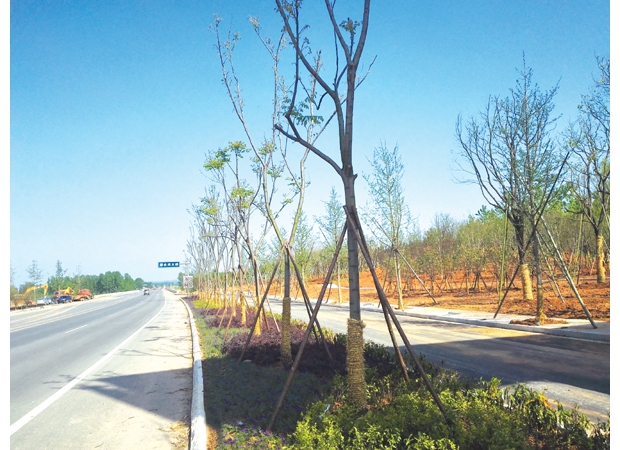 從3月初開始,市建投公司及市園林局的施工隊伍開始進場,將3公里的示范段分成五個標段,共有100多人奮戰在項目現場。4月18日,記者看到,3公里示范段兩側的園林造型均已完成,不少地段已完成景觀喬木、灌木的栽植。近期春雨綿綿,景觀樹大多已發芽,葉子嫩綠嫩綠的,具有一定的觀賞性。據初步統計,示范段已平整綠地147700平方米,栽植喬木20余種16000余株,栽植色塊植物3200平方米,栽植灌木500余株。