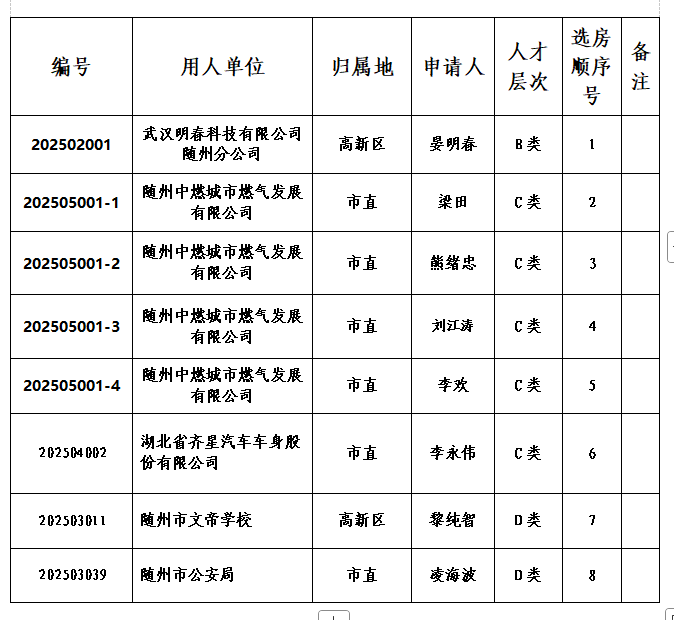 根據《隨州市人才公寓管理辦法(試行)》相關規定,經申請人申請,用人單位初審,創服公司受理,市住建部門房產核查,用人單位所在地人才辦資格審核,市委人才辦審批,共8名同志符合隨州人才公寓(產投·梧桐匯)租賃條件。本次配租原則上按照A、B、C、D類人才的先后順序依次選房;同類人才按照遞交申請時間先后順序依次選房;同一用人單位的同類人才,按照用人單位提交的《隨州市人才公寓租賃申請信息匯總表》排列順序依次選房。現將審核通過人員名單和選房順序號予以公示(詳見附件)。