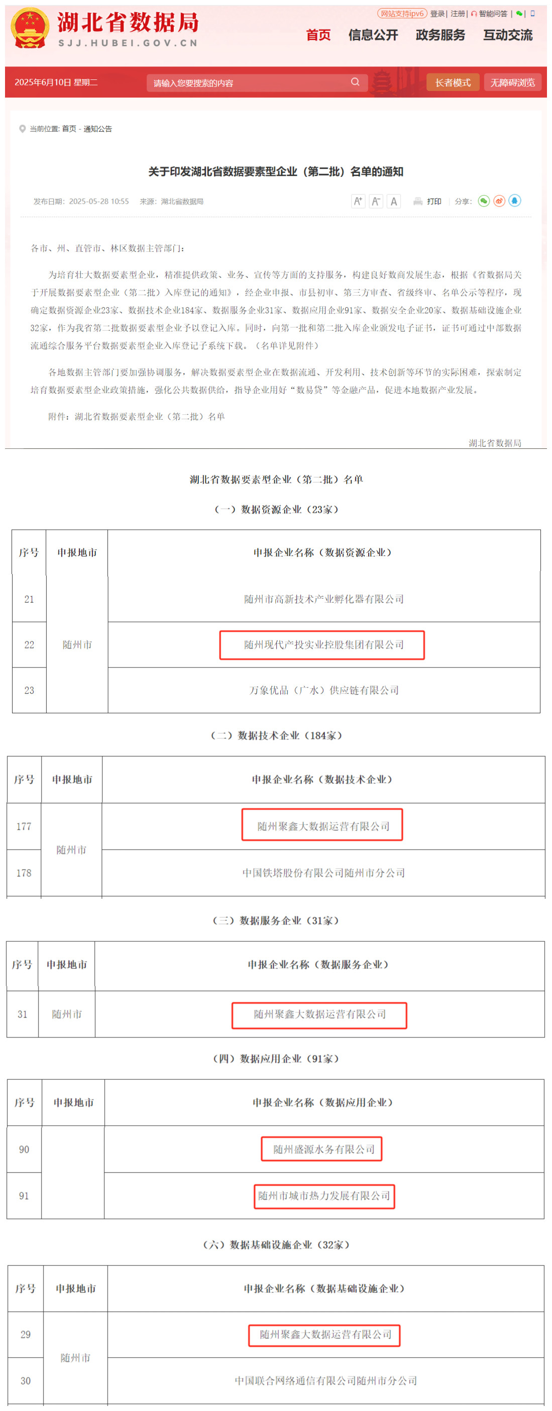 近日,湖北省數(shù)據(jù)要素型企業(yè)(第二批)名單公布,隨州產(chǎn)投集團(tuán)旗下3家子公司成功入選,標(biāo)志著集團(tuán)在產(chǎn)業(yè)數(shù)字化、數(shù)字產(chǎn)業(yè)化、數(shù)據(jù)要素市場化領(lǐng)域的探索實(shí)踐取得顯著成效。