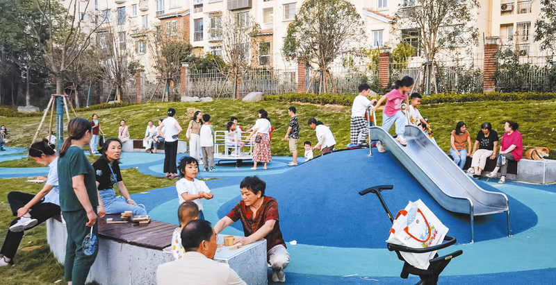 經(jīng)過改造后的隨城迎賓大道面貌煥然一新,一些路段新修了休閑步道、景觀廊亭、健身設(shè)施及兒童游樂設(shè)施等,成為市民休閑健身的熱門場所。圖為6月11日傍晚,孩子們在迎賓大道碧桂園小區(qū)路段新建的兒童游樂場中盡情玩耍。
