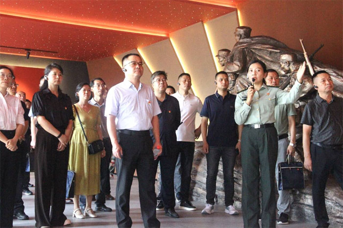 隨后,全體人員走進新四軍第五師革命歷史陳列館。館內,銹跡斑斑的步槍、泛黃的戰地日記、磨損的軍鞋靜靜陳列,無聲訴說著鄂豫邊區軍民浴血奮戰的崢嶸歲月;墻上的黑白照片里,戰士們與群眾并肩勞作、根據地辦學育人的場景,讓“堅守初心、服務人民”的精神內核愈發清晰。“每一件文物都是一段鮮活的歷史,每一個故事都是一次深刻的教育。”