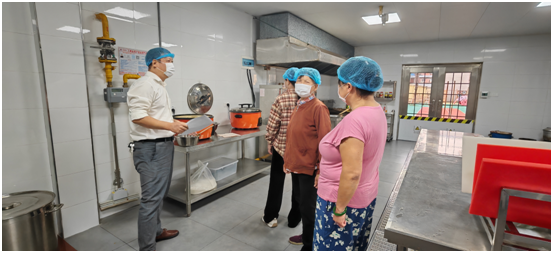 活動(dòng)當(dāng)天一早,校園門口的簽到臺(tái)就已布置妥當(dāng),家長(zhǎng)們一邊簽到,一邊和熟悉的老師、其他家長(zhǎng)輕聲交流。在食堂工作人員的帶領(lǐng)下,家長(zhǎng)們有序走進(jìn)后廚,從食材入庫(kù)到食材存放,從粗加工間到到清洗池,從切配區(qū)到烹飪間,大家看得格外仔細(xì)。貨架上的大米、食用油都貼著清晰的生產(chǎn)日期和質(zhì)檢標(biāo)簽,蔬菜分類泡在清水里,刀具、菜板按“生熟分開”的要求擺放整齊。一位爸爸忍不住拿起旁邊的記錄表:“每天的食材采購(gòu)、消毒記錄都寫得這么詳細(xì),我們放心多了。”