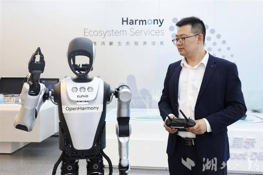 10月28日,鴻蒙生態(武漢)創新中心的智慧展廳,全球首臺搭載開源鴻蒙系統的機器人驚艷亮相,吸引不少參觀者與其互動。