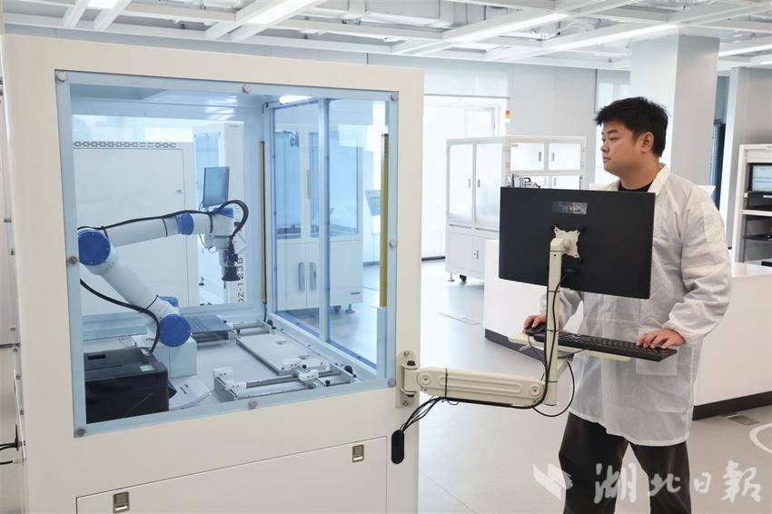 星漢實驗室內,工作人員通過六軸機械臂模擬用戶的真實操作,進行人機交互測試。(湖北日報全媒記者 陳少哲 攝)