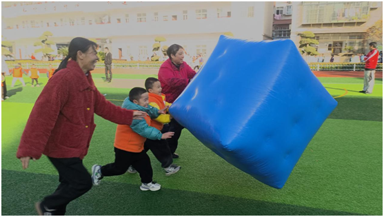 “運輸炸藥”環節中,家長與孩子通力協作,小心翼翼地將“正方體炸藥”運往目的地,“導彈發射”比賽中,“小兵”們背起“小火箭”勇往直前,家長緊隨其后,成為孩子最堅實的后盾;“全速前進”時,孩子們趴在“軍毯”上,由家長奮力牽引,現場加油聲、歡笑聲此起彼伏。
