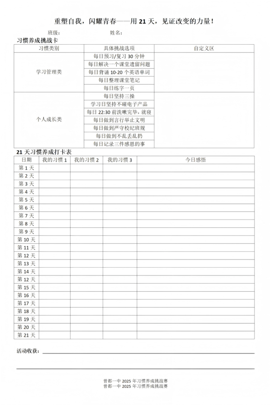 21天不是終點,而是美好起點。此次21天行為習慣養成挑戰賽,是曾都一中落實立德樹人根本任務的生動實踐,更是助力學生開啟自律人生的重要契機。
