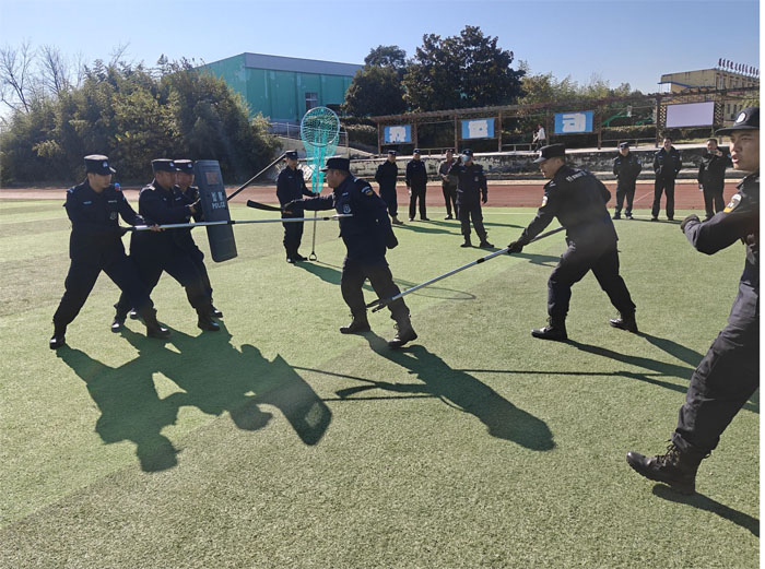 農場中心幼兒園組織全體教師開展了防恐防爆專題培訓及實戰演練活動。培訓中,安保負責人圍繞當前校園安全形勢,詳細講解了鋼叉、盾牌、抓捕器、橡膠棒等防護器械的正確使用方法。通過手把手教學、逐人糾正動作,確保每位教師熟練掌握器械操作與協同配合要領。隨后進行的實戰演練模擬“暴徒”強行闖入校園的場景。教師們迅速響應,分工協作,規范運用防護器械,順利完成防御、牽制與處置流程。
