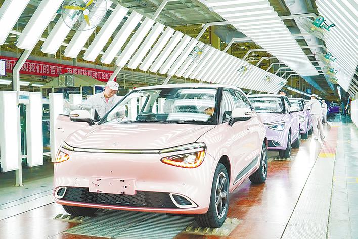 奕派科技襄陽工廠總裝車間,納米01整車下線。(湖北日?qǐng)?bào)全媒記者 趙怡然 攝)